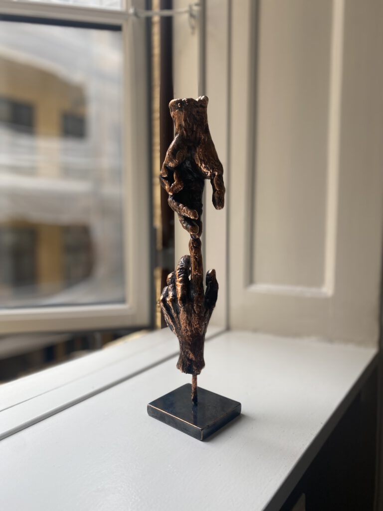 "Jeg har lånt den stump af Michelangelos værk fra det Sixtinske Kapel, hvor Gud besjæler Adam med sin finger. Det har jeg lavet til den her brobygger-pris, fordi brobygning også handler om at besjæle hinanden på den ene eller anden måde"