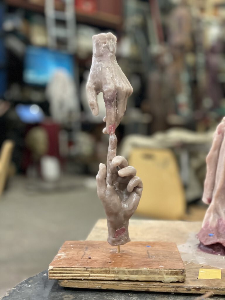 Sådan siger Jens Galschiøt om det kreative arbejde med prisen. Til venstre kan du se voksfiguren, mens den er under udformning i Galleri Galschiøt, kunstnerens galleri og værksted, som ligger lidt uden for Odense.